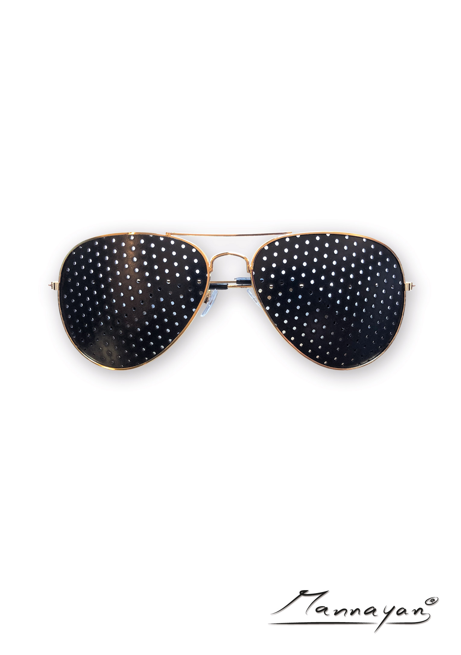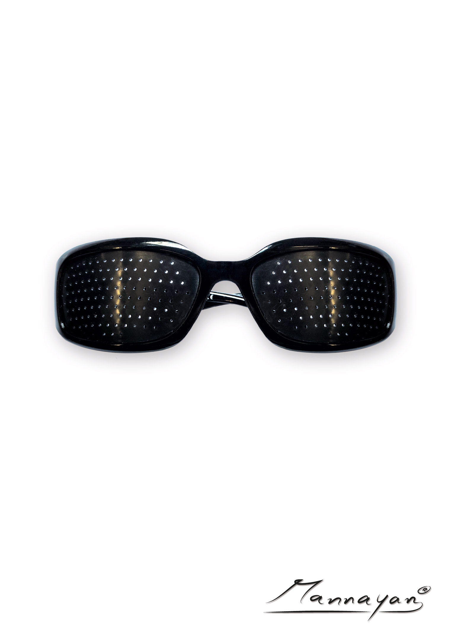 Statt den herkömmlichen geschliffenen Brillengläsern, sind in diese Lochrasterbrille dunkle Kunststoffgläser mit Lochraster eingesetzt, durch das die Augen gezwungen sind kleinere Bewegungen zu machen.