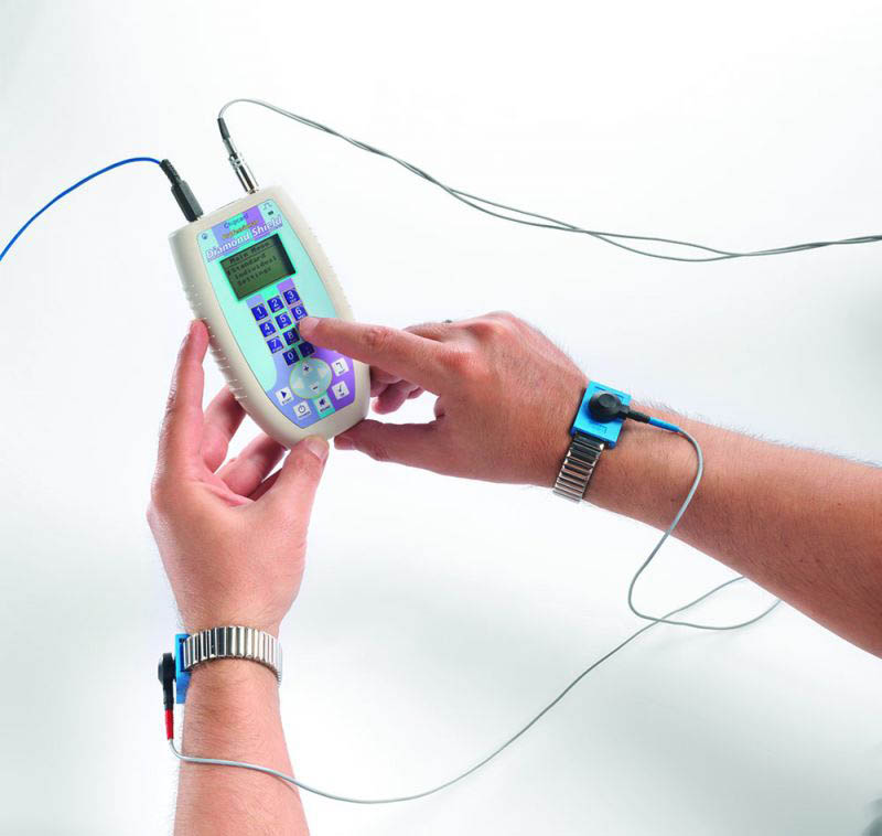 Ein Zapper ist ein handliches Gerät, das schwachen elektrischen Strom in spezifischen Frequenzen über zwei Elektroden durch den Körper leitet für verbessertes körperliches Wohlbefinden und Entspannung.